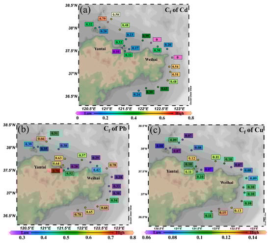 Contamination factors of (a) Cd, (b) Pb, and (c) Cu in the Shandong Peninsula, China.