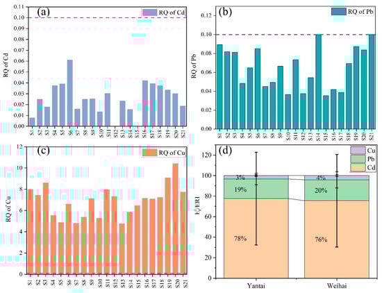 In this study, the Cf values indicated low Cd, Pb, and Cu pollution levels in the coastal waters of the Shandong Peninsula. However, the associated ecological risks cannot be evaluated solely by the metal’s concentrations but also by the bioavailability and impacts of these pollutants on aquatic organisms. The bioavailable fractions of Cd, Pb, and Cu can negatively affect the growth, reproduction, and behaviour of marine species. Therefore, the associated ecological risks were assessed in this study using the RQ values (Figure 6a–c). The obtained RQ values of Cd and Pb ranged from 0 to 0.061 and 0.036 to 0.100, respectively, indicating low associated ecological risks (RQ < 0.1). On the other hand, the RQ values of Cu ranged from 4.756 to 10.416, indicating high associated ecological risks (RQ ≥ 1.0). These findings highlight that Cu poses significant ecological threats due to its bioavailability.