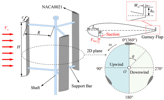 Geometric configuration of the reference VAWT and blade with combined flow control.