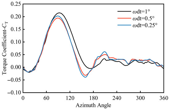 The Unsteady Reynolds-Averaged Navier–Stokes (URANS) method is employed for numerical simulation in this study. The selection of time step size is generally governed by the characteristic time scale of the unsteady flow. Considering the periodic rotational nature of VAWTs, the angular displacement of the blade per unit time is used as the time step, with values set at 0.25°, 0.5°, and 1°. To balance computational accuracy and efficiency, a time-step independence study is conducted.