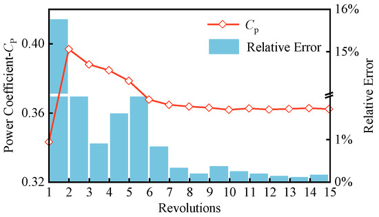 Figure 6 presents the variation of Cp and its relative error at TSR = 2.64. At the beginning, Cp shows clear fluctuations as the flow field develops. From the 7th revolution onward, the relative error falls below 0.5% and the variation of Cp becomes negligible, indicating that both the rotor and the wake have reached a quasi-steady state. To further confirm convergence, the simulation was extended to 15 revolutions, which showed no significant changes compared with the 10th revolution. Therefore, the 10th revolution is selected as the reference for analysis, ensuring that the flow field is fully developed while avoiding unnecessary computational cost.