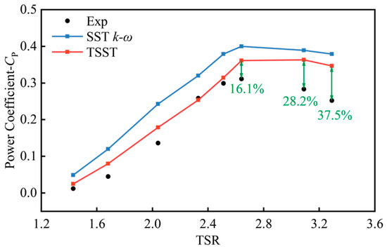 For clarity, several relative errors between numerical predictions and experimental results are also annotated in Figure 7. These values provide a quantitative indication of the deviation while confirming that the TSST model yields results in closer agreement with the experimental data than the SST k-ω model across the entire TSR range. Therefore, the TSST model was adopted for the subsequent numerical simulations in this study.