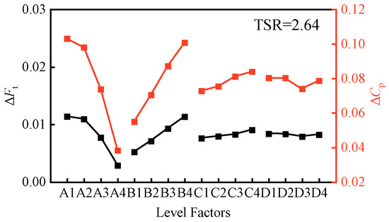 Figure 8 illustrates the trends of ΔCT and ΔCp across different factor levels, revealing consistent response patterns. The optimal parameter combination was determined as A1B4C4D2, corresponding to Ls = 0.05 c, Ws = 0.03 c, hG = 1.5% c, WG = 0.1 hG.