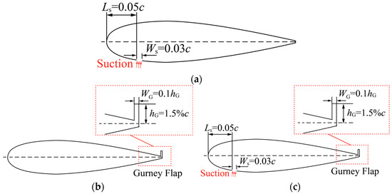 To further evaluate the performance advantages of the hybrid flow control strategy over individual control methods, three blade models were constructed based on the previously optimized parameter combination: (a) a suction control model (OPT_Suc), incorporating only the optimal suction parameters; (b) a gurney flap control model (OPT_GF), featuring only the optimal gurney flap configuration; and (c) a hybrid control model (OPT_Suc + GF), combining both suction and gurney flap parameters. The geometric configurations of the three blade models are illustrated in Figure 9.