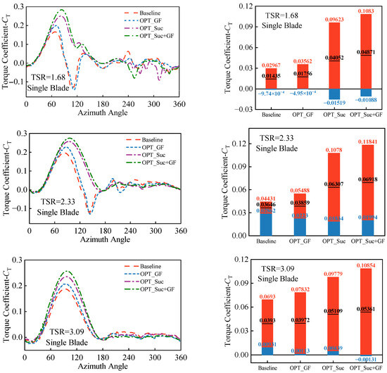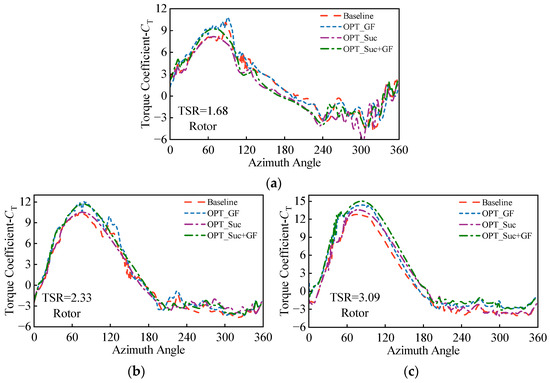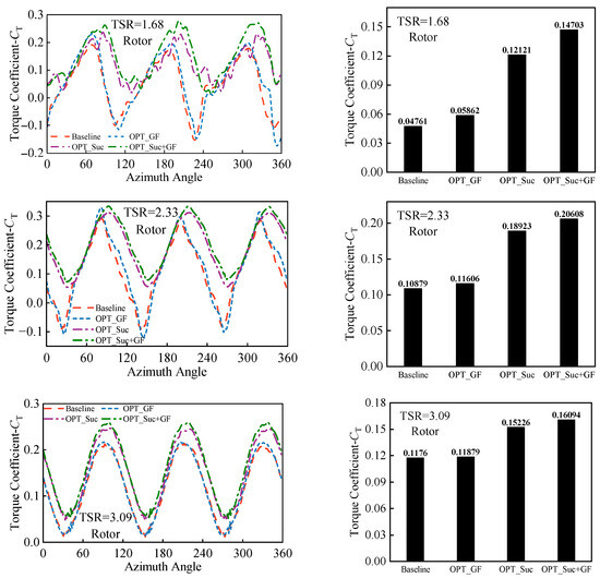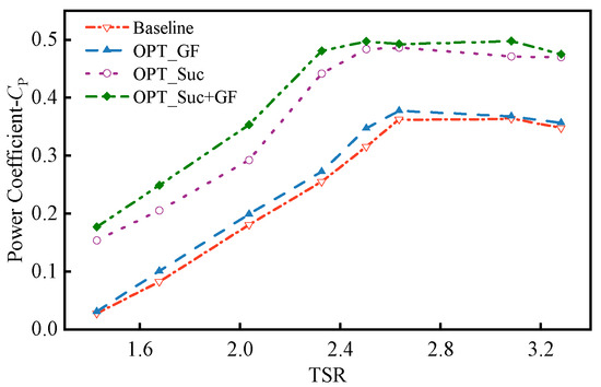 Power coefficient variations for different rotor configurations over a range of TSR = 1.43~3.29 are presented in Figure 10. For clarity, the control schemes OPT_GF, OPT_Suc, and OPT_Suc + GF are hereafter referred to as GF, Suc, and Suc + GF, respectively.