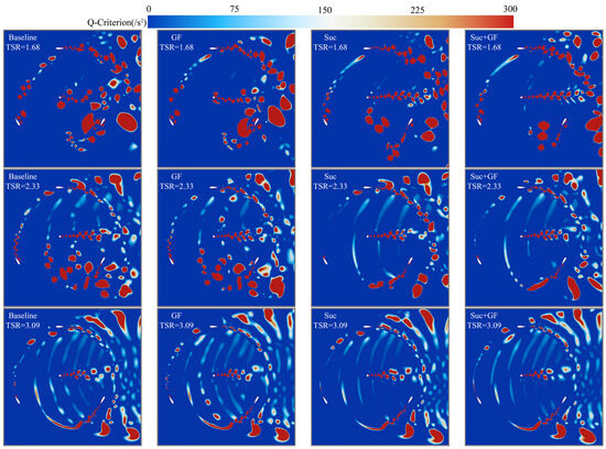 Compared with the Baseline, which exhibits strong flow separation and large-scale vortex shedding in the upwind region, the GF configuration provides only moderate suppression. In contrast, suction control (Suc) effectively delays separation and reduces vortex intensity, while the hybrid strategy (Suc + GF) consistently produces the smallest vortices and the most organized wake distribution across all TSRs. This superior performance arises because suction removes low-energy boundary layer fluid and delays stall, while the Gurney flap enhances trailing-edge pressure recovery and stabilizes the wake. Their combined effect explains the improved aerodynamic efficiency and stability achieved by the hybrid control scheme.