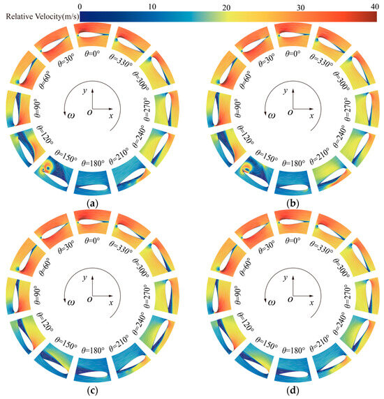 To further investigate the mechanisms by which different flow control strategies affect the aerodynamic performance of VAWTs, Figure 15 presents the relative velocity vector fields of single blades under various configurations at TSR = 2.33 across different azimuthal angles.