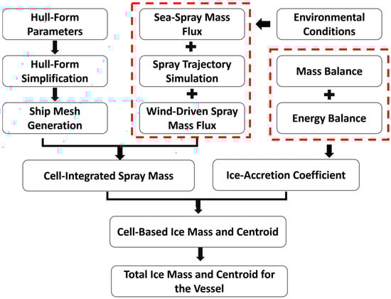 The ice accumulation calculations utilize parameters including the ship length, beam, and precise superstructure position as inputs for the calculation program. Due to the geometric complexity of hull complexity, the analysis employs a segmented-simplification approach. Additionally, since ice accumulation occurs primarily on the deck, calculations focus on the deck surface in the bow region. The program requires environmental inputs such as ship speed, wind speed, air temperature, and the relative angle between the ship’s heading and wind direction. The computational workflow is illustrated in Figure 1.