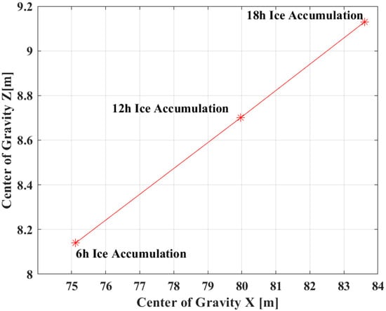 The ice accumulation simulation program was executed to model ice formation over periods of 6 h, 12 h, and 18 h. The calculated ice mass accumulation on the hull deck surface and the corresponding center of gravity of the ice-laden vessel for each time interval are presented in Figure 3 and Table 3.