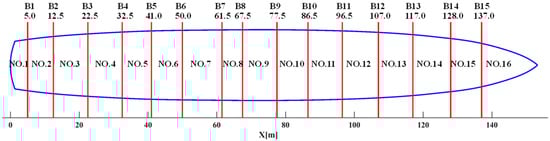 The DTMB-5415 model features 15 watertight transverse bulkheads that partition the hull into 16 distinct compartments, labeled from NO.1 to NO.16. Figure 4 depicts the arrangement of these watertight bulkheads and compartment divisions.