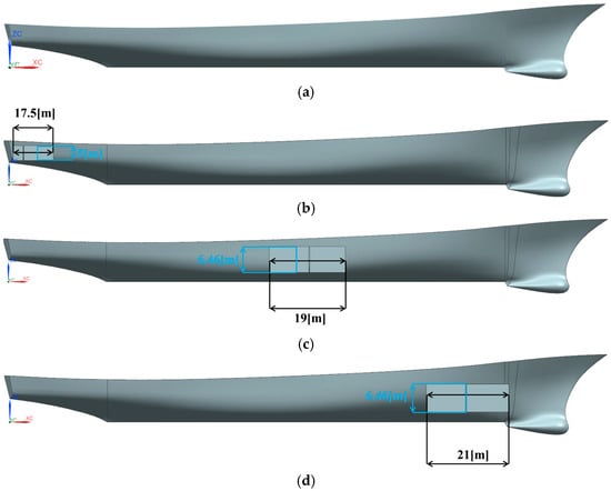 DTMB5415 geometric model diagram: (a) Intact ship; (b) Damage to the NO.2–NO.3 compartments; (c) Damage to the NO.9–NO.10 compartments; (d) Damage to the NO.13–NO.14 compartments.