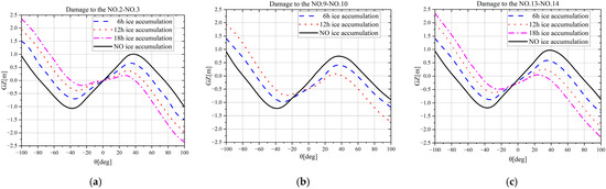GZ curves of a damaged ship under varying ice-accumulation durations. (a) Damaged ship in compartments NO.2−NO.3; (b) Damaged ship in compartments NO.9−NO.10; (c) Damaged ship in compartments NO.13−NO.14.
