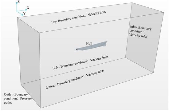 This research utilizes the DTMB-5415 ship model with a scale ratio of 1:51 to simulate the free rolling decay motion of the vessel. the model dimensions utilized in DTMB-5415 were kept consistent with those employed in EFD, facilitating the validation process. Previous research on the scale effects between model scale and full-scale vessels has indicated that the influence of free decay experiments conducted to obtain dimensionless natural periods and damping coefficients for roll motion is negligible and can be disregarded [29]. Consequently, the damping coefficient obtained through CFD computations at the model scale with the primary ship parameters presented in Table 1 of Section 2.2 can be employed in subsequent study. The initial conditions specify a speed of 0 knots and an initial heel angle of 28°. The VOF wave is configured to still water. The free rolling decay curve is determined by recording the rolling angle time history in real-time. To manage the large rolling amplitudes during simulation, overlapping mesh technology is implemented, dividing the computational domain into two regions: the background domain and the overlapping domain. The background domain measures 10 m × 3.6 m × 5.4 m, and the boundary conditions are specified as illustrated in Figure 8.
