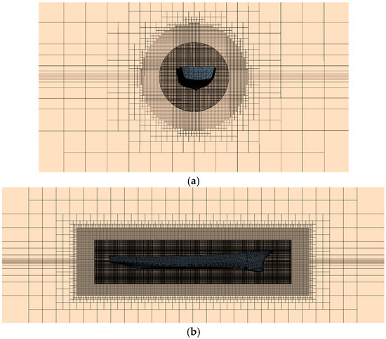 The mesh generation process is performed using the automatic meshing function in STAR-CCM+2406, with a base mesh size of 1 cm and a mesh size for the overlapping domain set to 0.25 cm. The free surface region is refined using anisotropic meshing, with refinement percentages of 50% in the X and Y directions and 2.5% in the Z direction. The hull surface receives 6.25% refinement, while the surface of the computational domain surface is refined to 400%. A cylindrical transition refinement zone between the overlapping and background grids ensures a smooth transition and prevents interpolation errors during rotational motion. The overlapping grid’s prism layer mesh configuration includes 10 prism layers, a 1.3 growth rate, and 25% total prism layer thickness, maintaining a wall Y+ value ≤ 5. The completed mesh comprises 3.41 million cells total, with 1.39 million cells in the background domain and 2.02 million cells in the overlapping domain. Figure 9 illustrates the specific mesh division. The numerical simulations incorporate several models: implicit unsteady solver, cell mass correction, gravity, Eulerian multiphase flow, and the k–epsilon turbulence model. The VOF method simulates the still water wave model. The solver implements second-order time discretization with a 0.005 s time step. The Dynamic Fluid Body Interaction (DFBI) method models the motion in the overlapping region. In the present study, to simulate free-decay motion for the evaluation of roll damping, only the roll degree of freedom was released, while all other degrees of freedom were constrained.