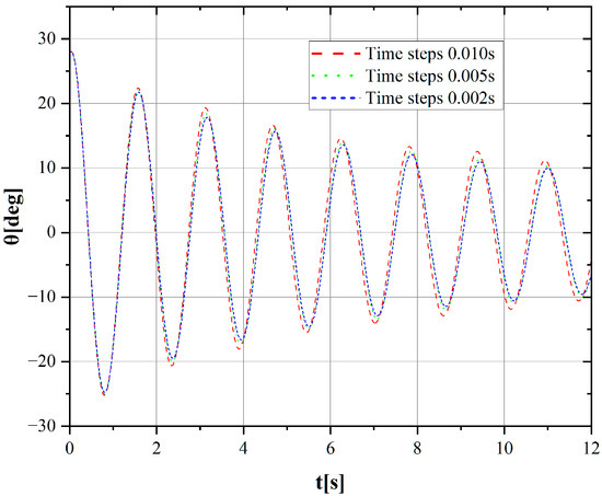 The numerical simulation model previously described is utilized to compute the free rolling decay motion. Time step independence and mesh independence verification are conducted, and the free rolling decay curve derived from the simulation is compared with experimental data [8]. To ensure numerical fidelity of the free-decay simulations, both time-step and mesh independence studies are performed. The time-step independence assessment involves repeating the free-decay runs under identical conditions using three different time increments (0.002 s, 0.005 s, and 0.01 s), with the resulting roll-decay histories compared in Figure 10. Subsequently, mesh independence is evaluated following the ITTC grid-refinement guidelines [30] by systematically refining the base mesh according to a grid-refinement ratio. The grid refinement ratio r is defined as follows: