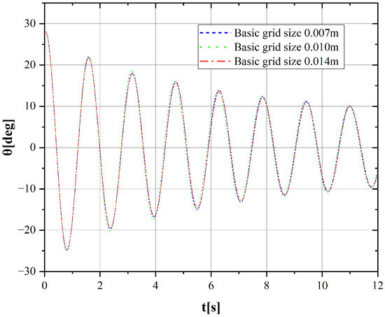 Based on a base grid size of 0.01 m, three grid schemes are generated with a refinement ratio of : coarse mesh, medium mesh, and fine mesh. The corresponding base grid sizes are 0.007 m, 0.01 m, and 0.014 m, respectively. Free rolling decay motion simulations are performed for each of these three mesh schemes. The computational results are presented in Figure 11.