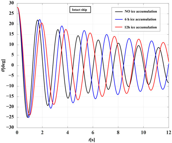 Comparison of free rolling decay curves for the intact DTMB-5415 ship at different ice accumulation durations.