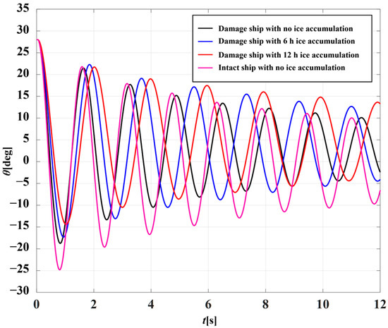 Comparison of free rolling decay curves for the damaged DTMB-5415 ship at different ice accumulation durations.