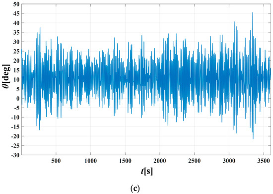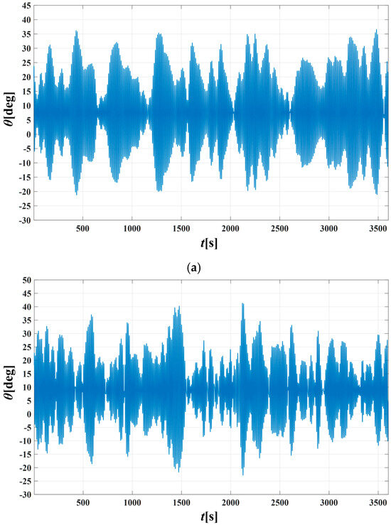 By incorporating the ship roll moment into Equation (24), the wave-excitation moment spectrum associated with the relative excitation moment m(t) was determined. For the specified sea-state parameters, after obtaining the spectrum, a random time series of the excitation was generated through linear superposition. The coefficients of a fourth-order linear filter were identified using the least-squares method, and the single-degree-of-freedom roll motion Equation (21) under combined wind–wave forcing was integrated using a Runge–Kutta scheme to produce the roll–response time history. The roll–motion responses of the intact vessel for the three sea states are illustrated in Figure 16, based on a simulation window of 3600 s.