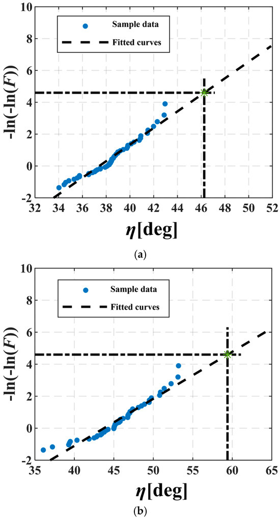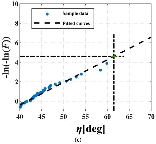 Following the data-volume recommendations of Chai et al. [31], 50 independent simulations were conducted, each with a duration of 3600 s, to predict roll-motion extremes. From the resulting roll-motion time histories, peak values were extracted, providing 50 samples of maximum roll amplitude. Based on the Gumbel extreme-value model, the sample set underwent linear fitting fitted in an extreme-value probability plot using the least-squares method. Through extrapolation to an exceedance probability of λ = 0.01, the predicted extreme roll angle was determined. Figure 17 illustrates the statistical results for the damaged ship under dead ship conditions with ice accumulation across various sea states. In this case, the icing scenario corresponds to a 12-h accumulation period, and the damage results in asymmetric flooding of compartments NO.13–NO.14, including the fitted Gumbel curves and the forecast extreme value η. In this plot, the horizontal line at λ = 0.01 intersects the fitted curve; the abscissa of this intersection point indicates the predicted extreme roll amplitude.