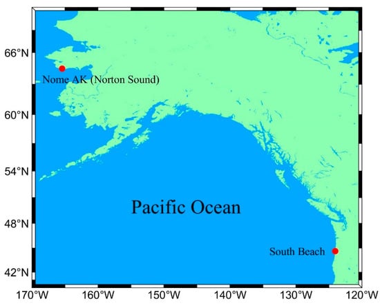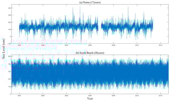 In this paper, the sea level observations at two tidal gauges (Figure 1) are selected, which are provided by the University of Hawaii Sea Level Center (UHSLC, https://uhslc.soest.hawaii.edu/, accessed on 23 August 2021). A 17-year record (from 1998 to 2014, Figure 2a) at Nome (Alaska) and a 20-year water level record (from 1997 to 2016, Figure 2b) at South Beach (Oregon) with hourly intervals are used.