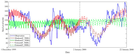The forecast for 3 weeks (2–22 January 2000) using F_TIDE and T_TIDE to analyze the data in 1999 (1 January 1999 to 1 January 2000). For clarity, the figure only shows the results from 1 December 1999 to 22 January 2000; the vertical black dashed line indicates the start time of the prediction.