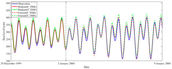 The forecast for 1 weeks (2–9 January 2000) using F_TIDE and T_TIDE to analyze the data in 1999 (1 January 1999 to 1 January 2000). For clarity, the figure only shows the results from 29 December 1999 to 9 January 2000; the black dashed line indicates the start time of the prediction.