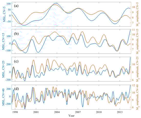At the Nome gauge with the shallow water depth [46], the time-varying amplitudes of the M2 tidal constituent and the time-varying MSLs are obtained by F_TIDE with different CNs, and the correlation coefficients reached 0.78, 073, 0.66, and 0.52 (Figure 5). The high correlation coefficients between the M2 amplitude and the MSL indicate that tide changes may be driven by water depth changes due to MSL changes. With decreases in CN, the correlation coefficients increase, indicating that the impact of MSL changes on tidal amplitudes is principally reflected on long time scales. Recent research has shown that rising sea levels will increase the tidal range in many areas, such as the Delaware estuary [47], Gulf of Mexico [48], and some portions of the Bohai Sea [49,50]. Changes in water depth have been explored as one of the main drivers of changes in tides at the regional/global scale [17,21,51,52]. Tides behave as shallow-water waves and thus are strongly affected by water depth [7]. At the Nome gauge with the shallow water depth and weak tide, the variation of the tide is almost dominated by the variation of the MSL.