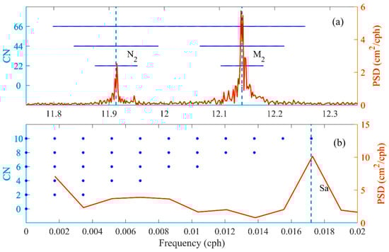 The power spectral densities (red line) of the 10 yr sea level at the Nome gauge and frequency bands (blue dot) at different CNs for (a) N2 and M2 constituents and (b) MSL.