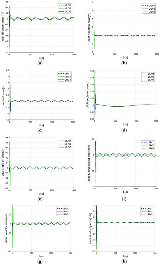Figure 8a–e show the position and attitude errors of the UUV formation. At 46 s, the formation gradually stabilizes. The maximum absolute errors for all three axes are less than 0.1 m, the longitudinal tilt steady-state error is less than 0.001 rad, and the maximum absolute error for the heading angle is less than 0.03 rad. Even under the influence of the current disturbance and model uncertainty constraints, the preset UUV formation can still be formed and maintained, and both the position and the attitude errors are limited and kept within a small range. Figure 8f–j show the velocity and angular velocity errors of the UUV formation. At 36 s, the angular velocity error converges, and the maximum absolute error of the three-axis speed is less than 0.05 m/s. The velocity and angular velocity of the UUV formation are still able to track the upper desired value, even under the influence of the current interference and model uncertainty constraints, and the errors are all limited and kept within a small range, which validates the effectiveness of the formation-control strategy.