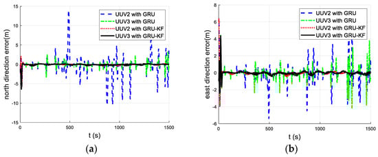 - In order to solve the problem of communication packet loss, a GRU network is utilized to predict the time series of the leader’s trajectory; then, a Kalman filter is introduced, and the predicted value of the GRU network is used as the measured value of the state in the Kalman filtering algorithm to update the leader’s state in real time. This method can optimize the control performance of the UUV formation under the influence of communication packet loss and reduce the control errors caused by external environmental interference.