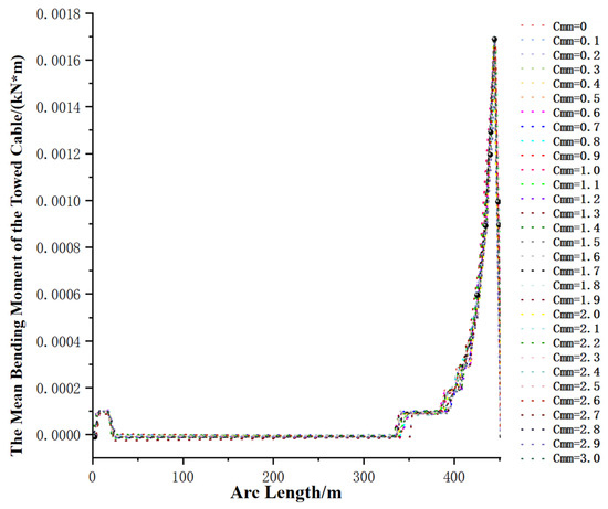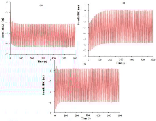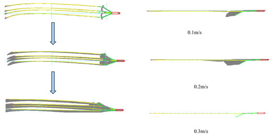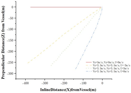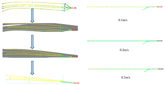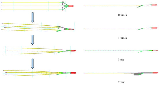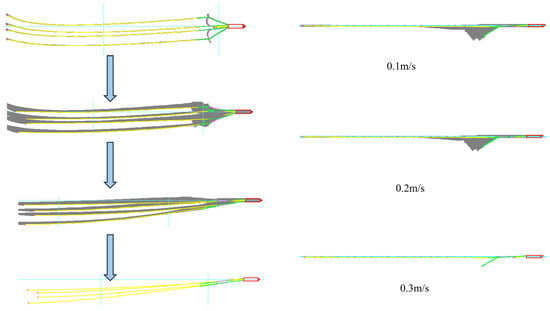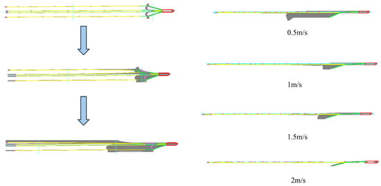 In this scenario, the breakage position of the mooring line is set at the root, and the reasons for the selection are as follows: (1) Under the condition that the forward direction of the tugboat is opposite to the ocean current, the axial tension of the main cable increases with the increase of the ocean current velocity, resulting in a further concentration of the force transfer load at the root position; (2) In Table 3 of the original text, the EI of the “Lead-in type mooring line” is 0.02 kN·m2, indicating a relatively low flexural stiffness. The root position, as a “rigid-flexible connection point”, is prone to stress concentration due to the sudden change in stiffness. Observation of Figure 3 shows that: the faster the countercurrent velocity is, the larger the angle of the broken port side cable A (i.e., the left-side guiding cable labeled A in the multi-branch towed array system, see Figure 2 for the system structure) deviates from the vertical downward direction after the system is stabilized; it can be expected that, if the countercurrent velocity continues to increase, the broken port side cable A will rotate around its still restrained end by a certain clockwise angle under the impact of the current (the angle is greater than 90°), but at this time, the towing end of the port side cable A is at the rear and its free end is submerged in the water below. However, at this time, the towing end of the port side guide cable A is at the rear and immersed in the water, and eventually the port side guide cable A is traveling steadily with its free end at the front and its towing end slanting downward, and the larger the current velocity is, the larger the angle of rotation around its own end is. Further observation reveals that the formation of the port-side towing cable undergoes a process in which the overall formation shifts to the port side first and then gradually returns to the center of the ship. The reason for this phenomenon is that the initial offset to the port side is due to the loss of the constraints of the port side guide cable A. When it continues to shift t to the left side to a certain extent, the port side towing cable A begins to be constrained by the limitations of the unfolding device A. Coupled with the current direction of the countercurrent at this time, the above factors lead to the port side towing cable A’s formation position will ultimately and gradually close to the middle of the boat direction.
