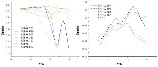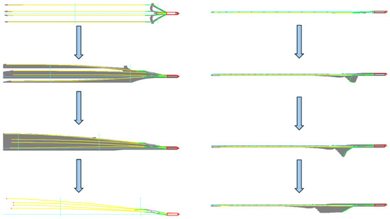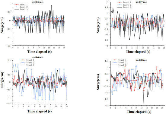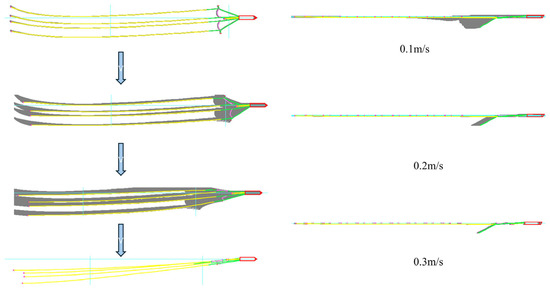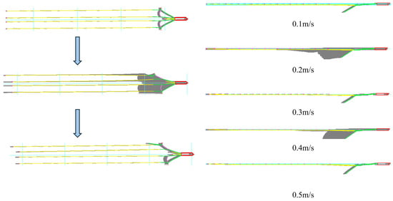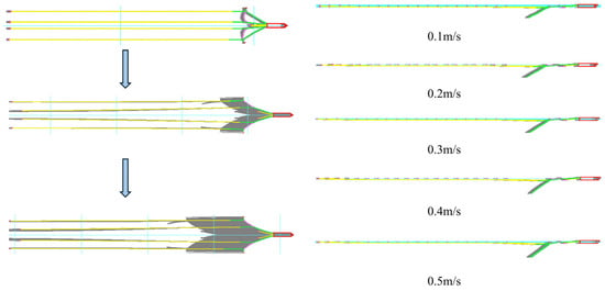 Observation of Figure 4 reveals that under countercurrent conditions, when both the port and starboard outboard guiding cables break, it is found that under different countercurrent velocities, when the whole multibranch towing system reaches stabilization, the towing cable formation in the whole towing system is symmetrical between left and right, and the larger the countercurrent velocities, the shorter the time needed for the towing system to reach the final stabilization stage is. There are some differences in the spatial pattern changes along the cable length at each time step before the whole towing system reaches stability, and the spatial pattern changes of the two guide cables are not synchronized at the initial stage, which is due to the difference in the moment of fracture; however, when the whole system enters into the stable stage, all the cables including the left and right side guide cables are symmetric at each time step, and the greater the countercurrent current, the shorter the time required for the towing system to reach the final stable stage. towing cables have the same cable body morphology at each time step.