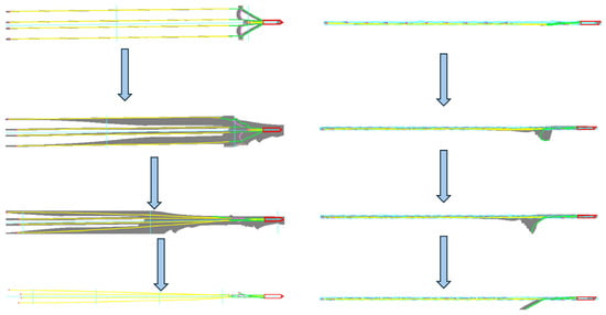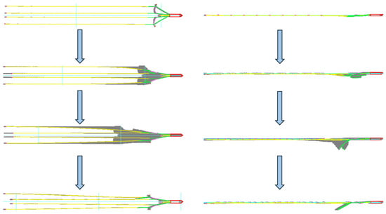 Symmetrical formation changes of multi-branch towed array after bilateral outboard guide cable fracture (countercurrent conditions, left: top view, right: side view).