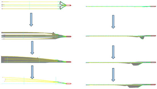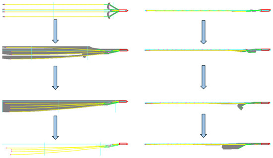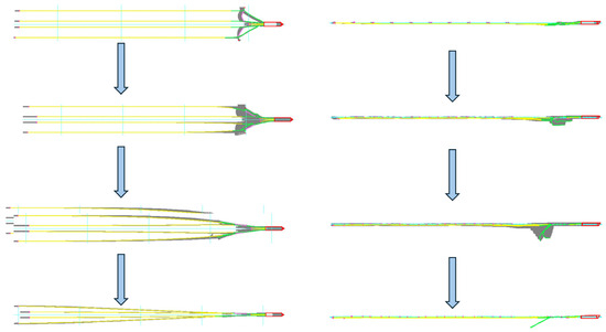 As Figure 6 shows the change of the multiline array after the breakage of the double outboard guide cables in the downstream state. As a matter of fact, the author found from years of simulation experience that in the countercurrent state, the speed of the tugboat can be extremely small or 5–20 times of the current speed, at which time the whole system is still relatively easy to reach the convergence state; however, in the downstream state, it is divided into two kinds of cases: one is that the towing speed of the tugboat is smaller than the current speed, and as the towing speed of the tugboat is closer to the current speed, the whole system’s convergence becomes worse and worse, and when the tugboat’s towing speed is not much different from the current speed, the whole towing system will not be able to converge; in the downstream state, when the speed of the tugboat is greater than the speed of the current, when the tugboat speed is 2–6 times of the current speed, the system can still converge, but the tension of each towing cable will be larger in this case. This tells us that in actual engineering practice, if we want to carry out towing operations in the downstream state, there are two methods to choose from, one is to travel at a towing speed that is much lower than the current speed, which has the advantage that the towing cables are under less tension but requires more time; the other is to make the tugboat travel at a high speed with a current speed that is 2–6 times of the current speed, but this has the advantage that it requires less time but the towing cables are under Tension is greater, easy to fatigue and fracture.