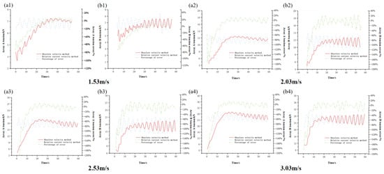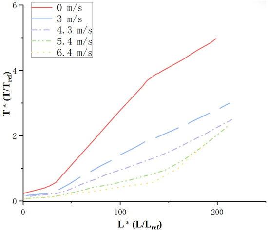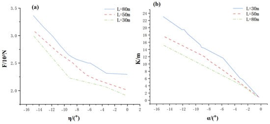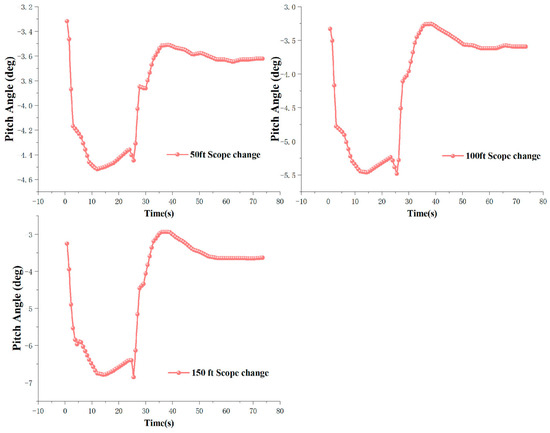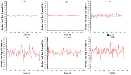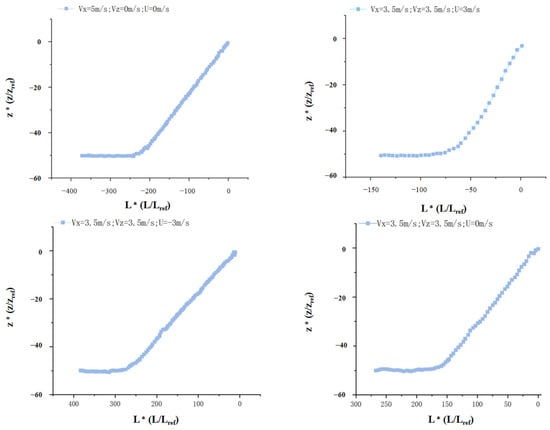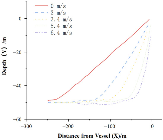 As Figure 5 shows that when the downstream current velocity is smaller than the towing speed of the tugboat, the larger the current velocity is, the smaller the angle of the broken port side cable deviates from the vertical downward direction after the system is stabilized, so it can be deduced that: if it can be realized in simulation, when the current velocity reaches the same speed as that of the towing speed of the tugboat, at this time, the broken port side cable should be in the natural hanging state. The larger the downstream current velocity, the smaller the angle of the broken port side cable deviating from the vertical downward direction after the system is stabilized; it can be expected that the larger the downstream current velocity is, the closer the broken port side cable is to the natural overhanging position (approaching but not reaching it), but at this time, the towing end of the port side cable is submerged into the water at the rear and bottom, and finally, the port side cable with its end at the front and the final towing end in the diagonally downward attitude is traveling steadily, and the larger the current speed is, the more it is in the natural overhanging state, and the greater the current velocity the smaller the angle at which it deviates from its natural overhanging position around its own end.