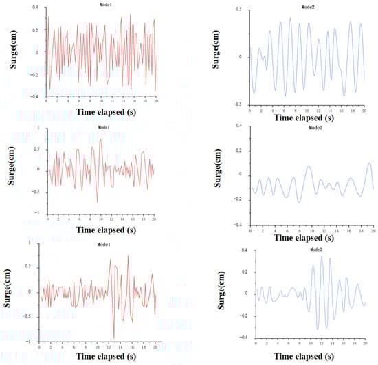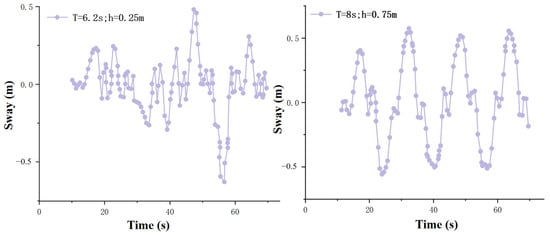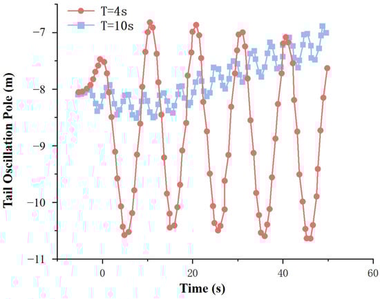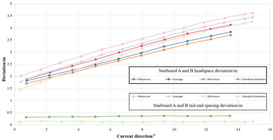 It was further observed that when the current velocity was 0.1 m/s, 0.3 m/s, 0.4 m/s, 0.5 m/s under the downstream condition, the overall formation of the port-side towing cable A did not undergo a significant offset back to the center of the ship after it was deployed after offsetting to the port side first, but when the downstream current velocity was 0.2 m/s, the phenomenon that the port-side line array was offset back to the center of the ship again. This is in marked contrast to the calculation results in the countercurrent condition. The spatial change of the overall formation of the port side towing cable A in the countercurrent condition will first be leftward and then return to the center of the ship, while there is no obvious phenomenon of returning to the center of the ship when the current velocity is low in the downstream condition. Combined with the results of countercurrent, it can be concluded that the reason for this phenomenon in the downstream state after the breakage of the port side of the guide cable A is: in the initial state to the port side of the offset is due to the loss of the constraints of the port side of the guide cable A, and when it continues to the left side of the offset to a certain extent, the port side of the towing cable A began to be restricted by the constraints of the unfolding of the spreader A, coupled with the direction of the current for the downstream tangential velocity is very small, so that the current of the Drag force is reduced, so the axial stretching effect on the towing cable is weakened, because the length of the towing cable is limited, so the weakening of the axial stretching effect in the transverse direction of the role of the expansion can be extended to increase the length of the above factors lead to a variety of comprehensive factors lead to the port side of the towing cable A formation position in the deviation of the port side of a certain distance directly to the dynamic equilibrium, so in the downstream state there is no general to the direction of the ship in the direction of the again However, when the downstream velocity is 0.2 m/s, the discharge frequency of the velocity synthesized by the velocity and the towing speed of the tugboat is similar to the self-oscillation frequency of the spreader A, which will trigger the high-frequency vibration of the spreader A, and the perturbation brought about by this vibration will break the equilibrium of the left line array system, and eventually make the formation of the port side towing cable A offset to the ship’s mid-direction once again. That is to say, in the downstream state, between the minimum allowable operating current speed and the maximum allowable operating current speed, it is possible to have a current speed that will make the towing line array formation spacing greatly reduced, and its specific size is related to the tugboat’s towing speed and the self-oscillating frequency of the spreader on the towing line array. It is possible to change its own vibration period by adding some attachments or reinforcing materials to the spreader, which can ensure a better formation spacing of the multi-branch towed array system in all the allowable current speed ranges during downstream operation in some sea areas. Therefore, it is not the case that the lower the current speed, the better the overall formation of the system will be maintained in the downstream condition.