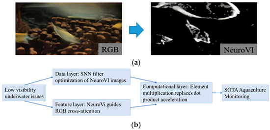 Fishery aquaculture safety perception in a harsh environment. (a) Comparison of the NeuroVI and RGB images; (b) framework diagram of the technical roadmap.