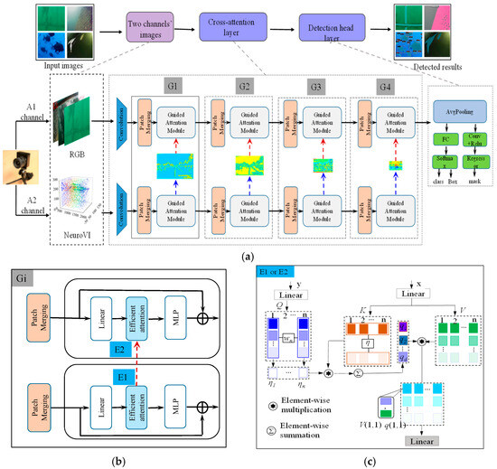 - A dual-image cross-attention network is designed for a fishery aquaculture cage (Figure 2b). The features from NeuroVI and RGB images are simultaneously extracted. And NeuroVI images are leveraged to provide spatial attention for RGB images, improving the learning efficiency of network in the fishery aquaculture.