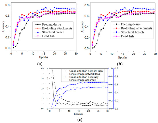 Training accuracy and learning loss are crucial evaluation metrics for assessing model learning performance, as depicted in Figure 5a,b. Although the resuspended sediments scene dataset exhibited a slower training speed, satisfactory training accuracy was eventually achieved among all four scenarios. Furthermore, images from four scenarios were integrated into a single dataset for another training process. In this process, both single-channel and cross-attention networks were employed to train images, as illustrated in Figure 5c. The results demonstrate that the cross-attention network exhibits higher training accuracy and lower training loss, indicating the superiority of the cross-channel network.