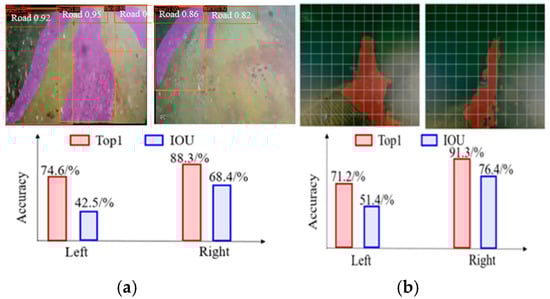 The segmentation of scenes is evaluated with the TOP1 and IOU indexes. (a,b) The left image corresponds to the single channel method, and the right image corresponds to the cross-attention method. Purple and red are the colors of the identified objects.