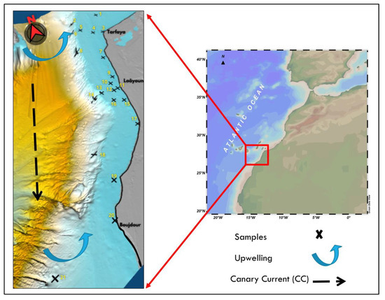The study area is located in the extreme northwestern region of Africa (Tarfaya–Boujdour area), between latitudes 28° N and 26° N. This zone is characterized by an arid climate dominated by persistent northwest trade winds and the Saharan Air Layer (SAL). Coastal upwelling, driven by the interplay of wind-forced Ekman transport, the southward-flowing Canary Current (averaging speeds of 0.1–0.3 m/s) [26], and Earth’s rotation, plays a critical role in shaping regional oceanography [27,28,29]. The Canary Current’s velocity further modulates sediment transport and nutrient distribution, influencing marine productivity [16].