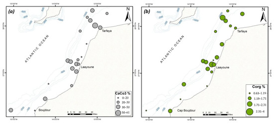 The carbonate content in the studied sediments ranges between 16.8 and 60.5 wt.%, with an average of approximately 32 wt.%. Higher concentrations (>45%) are observed in shallow stations within the Tarfaya and Laayoune regions and offshore Cap Boujdor (Figure 4a). When CaCO3 shows low content, organic carbon (Corg) and NO3− show high concentrations, as illustrated in Figure 2e and Figure 4a,b.