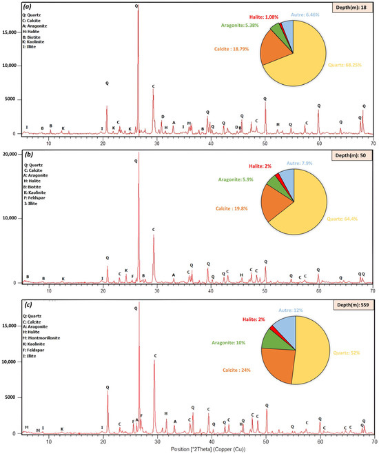 The mineralogical distribution shows significant variations with depth. The percentage of quartz decreases with depth (from 69 wt.% to 52 wt.%) (Figure 5a–c), reflecting depletion of terrigenous inputs. In contrast, the carbonate mineral content increases with depth, where the recorded percentage of calcite reached 24 wt.% in the outer shelf compared to the inner shelf, indicating a growing contribution from carbonate producing organisms.