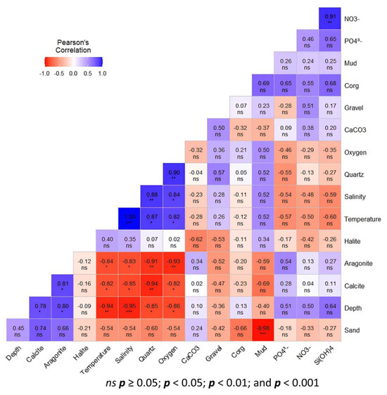 Complex interactions between physical processes, biogeochemical cycles, and external inputs are revealed by the correlations between sedimentological and hydrological indices found in the study area. The thermohaline gradient caused by coastal upwelling is seen in the strong negative correlation between depth and temperature (r = −0.94) and salinity (r = −0.95) (Figure 6). By bringing cold, nutrient-rich, and less salinized waters to the surface, this process encourages high primary productivity and planktonic organisms to produce carbonate (calcite and aragonite) [32,42]. However, the predominance of calcite, which is less soluble than aragonite, reduces the amount of carbonate that dissolves partially at depth [23,43].