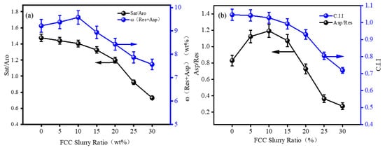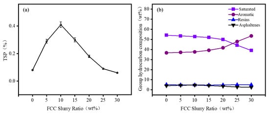 SARA analysis demonstrated that the ω (Asp/Res) ratio and ω (Asp + Res) show consistent trends with TSP, reaching a maximum at 10% FCC incorporation, indicating weakened peptization capacity of resins. Beyond this threshold, the enhanced aromatic content of FCC slurry oil improved colloidal stability by suppressing asphaltene aggregation.