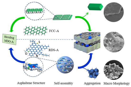 XRD and SEM analyses showed distinct structural differences between RDS-derived and FCC-derived asphaltenes. FCC-A had smaller molecular dimensions and higher aromaticity, forming planar aggregates, while RDS-A were larger and heteroatom-rich, leading to spherical aggregation. MDO-A exhibited FCC-dominated sediment architecture, with spherical RDS-A particles embedded in FCC-A matrices, confirming FCC asphaltenes as the primary sediment precursors. XPS confirmed that heteroatoms (N, S, O) in MDO-A asphaltenes were mainly derived from RDS-A.