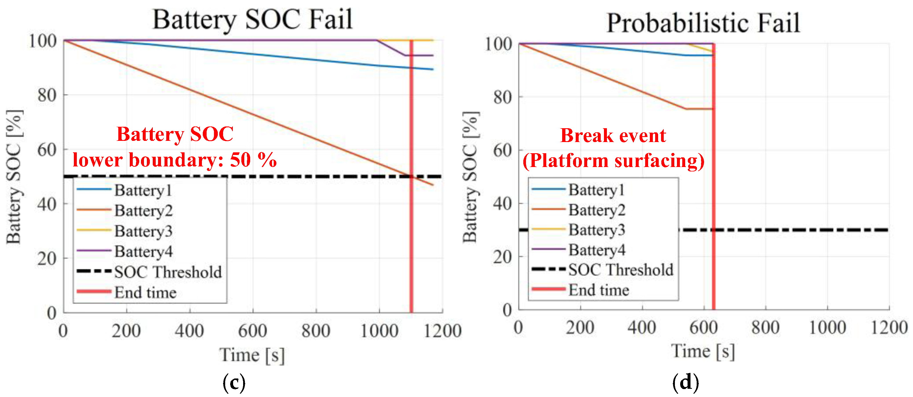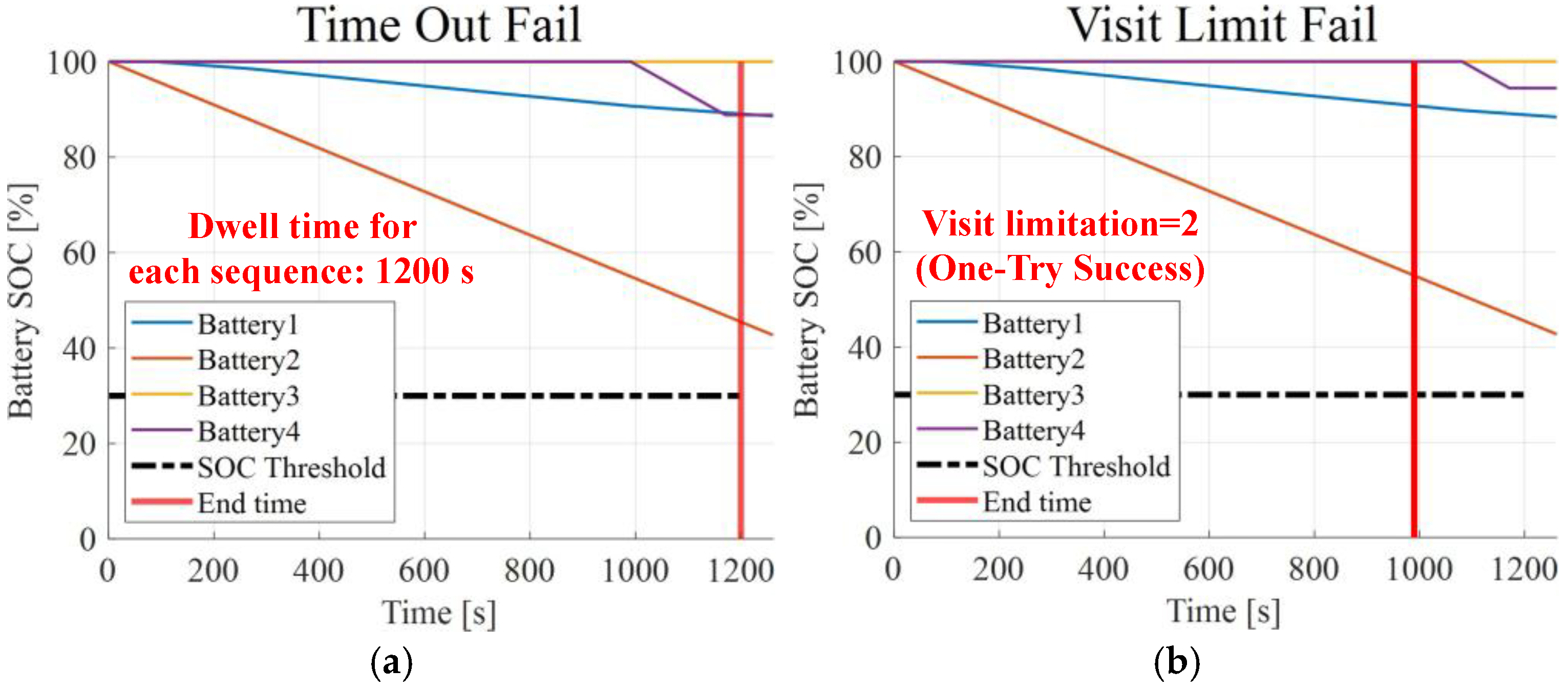Figure 7. The target completion time of the scenario was set to 20 min, and the dwell time in both the normal and response sequences was set to 90 s. For failed docking, an SOC graph of each battery over the elapsed time of the scenario is shown in