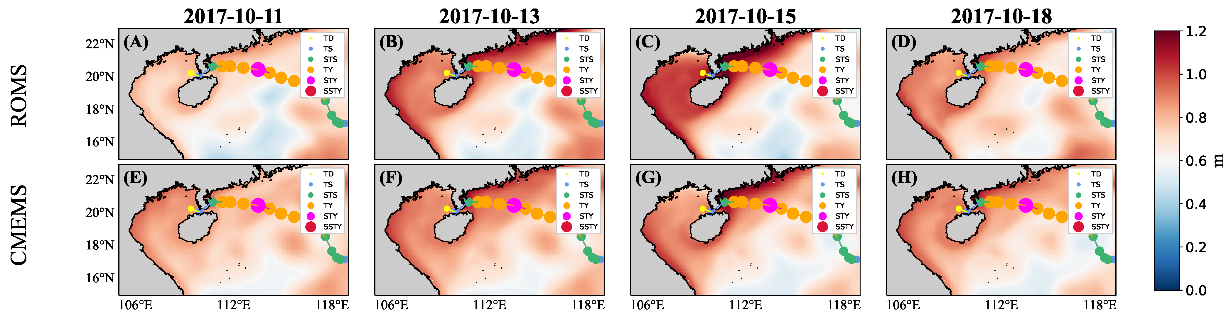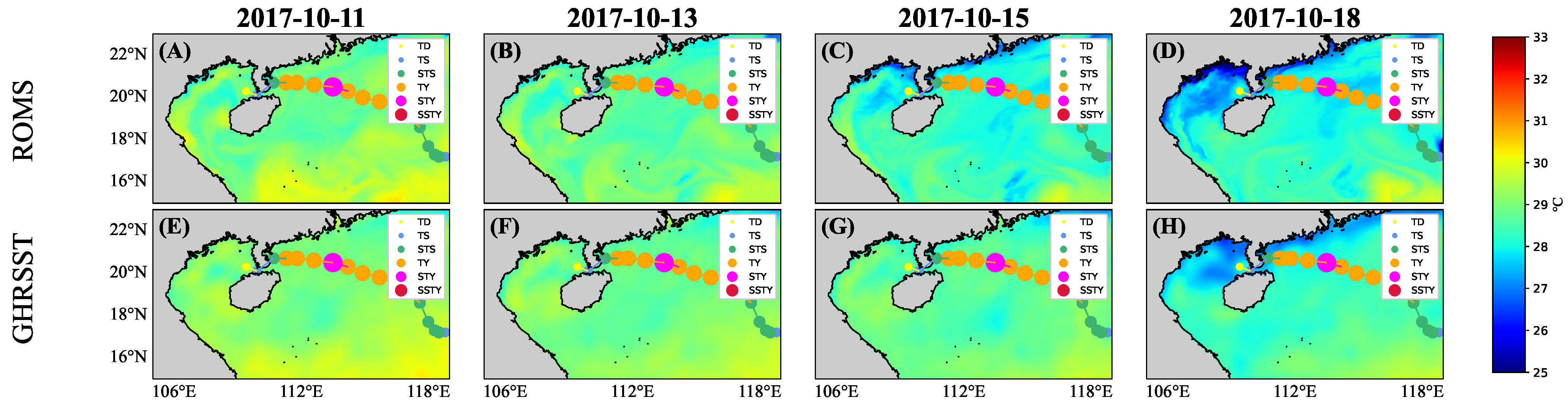 The ROMS model was used to simulate sea surface temperature (SST) and sea surface height (SSH) variations induced by Typhoon Khanun (October 2017) in the South China Sea, validated against GHRSSST, Jason-2/3, and HY-2 satellite observations (see
