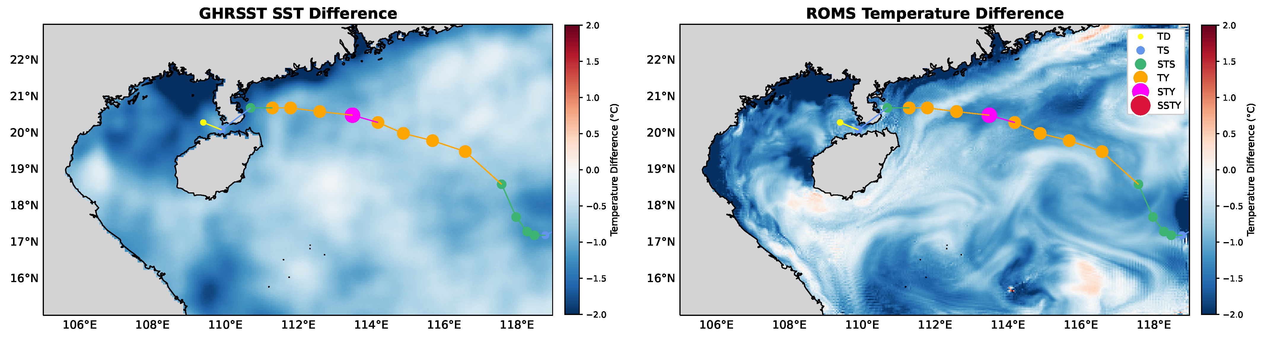 The Regional Ocean Modeling System (ROMS), coupled with satellite remote sensing, provides a robust framework for studying typhoon–ocean interactions. Satellite remote sensing delivers high spatiotemporal resolution data for parameters such as sea surface temperature (SST), sea surface salinity (SSS), and surface wind fields [